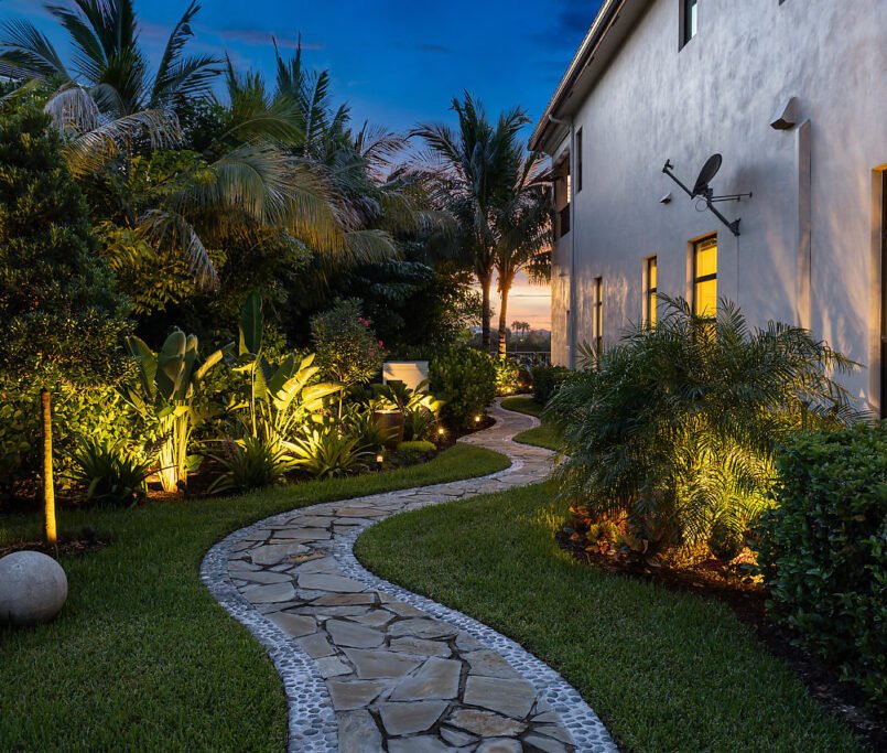 Side gardens are never an afterthought for me. On one side, I created a meandering stone path that accents and expands each of the rooms inside the home. On the other side of the house we visually made use of a community easement to make it appear to be a part of the client’s property.