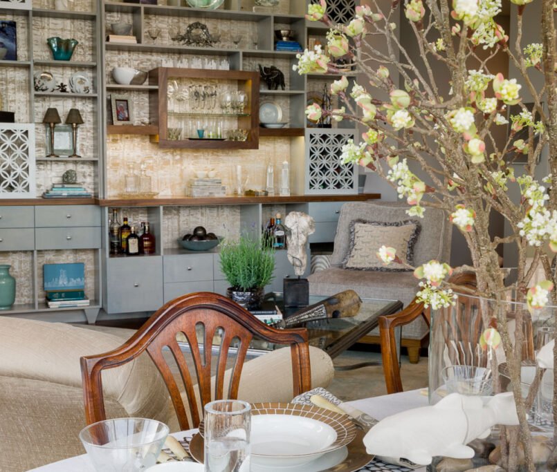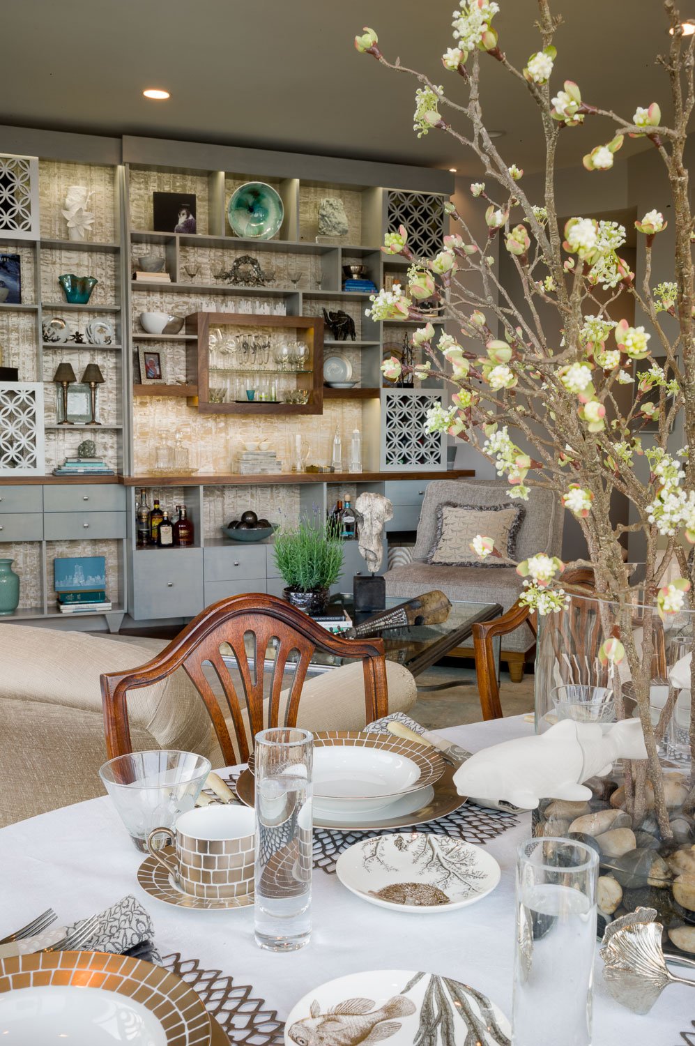 Designer’s note: Creative millwork that incorporates books, objects, bar or tableware is our specialty. We can also select all your tabletop items such as china and linens to work with your new scheme so when it’s time to entertain, everything coordinates perfectly.