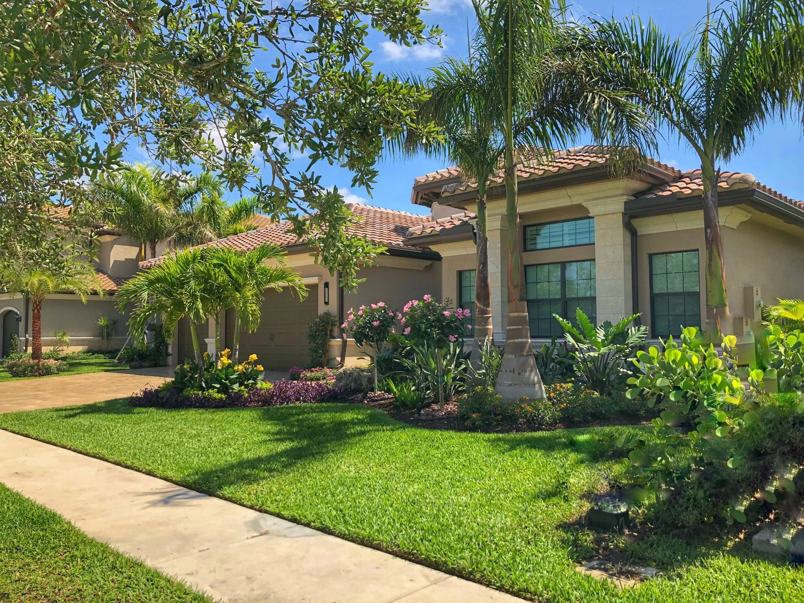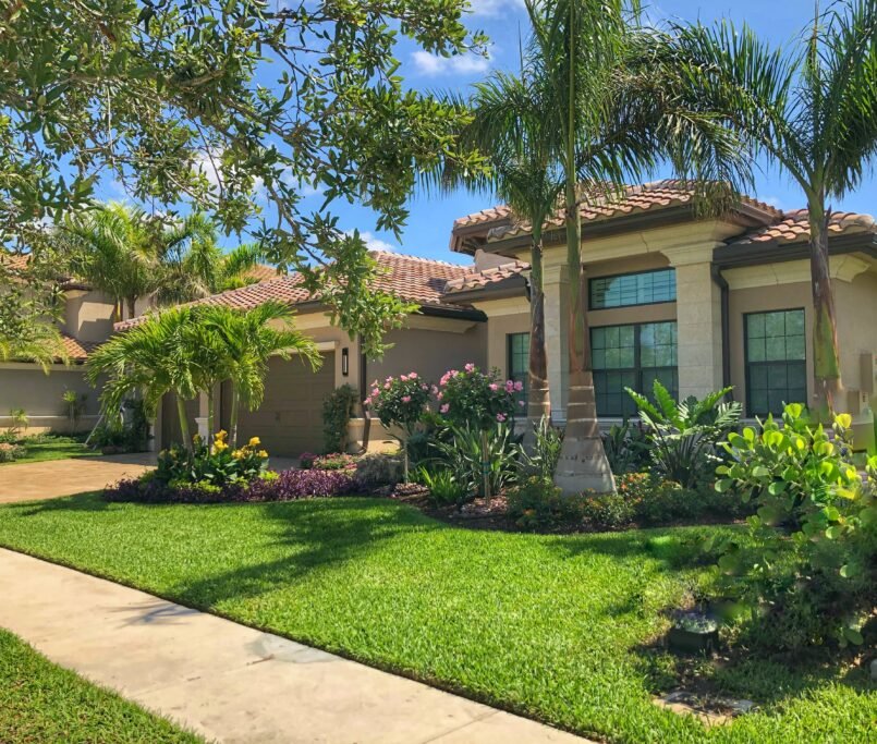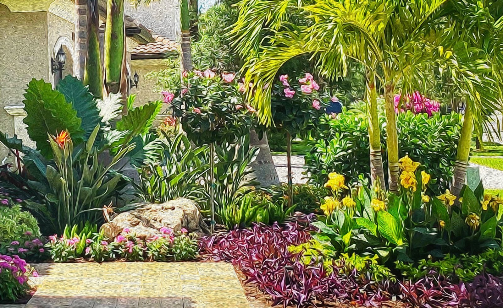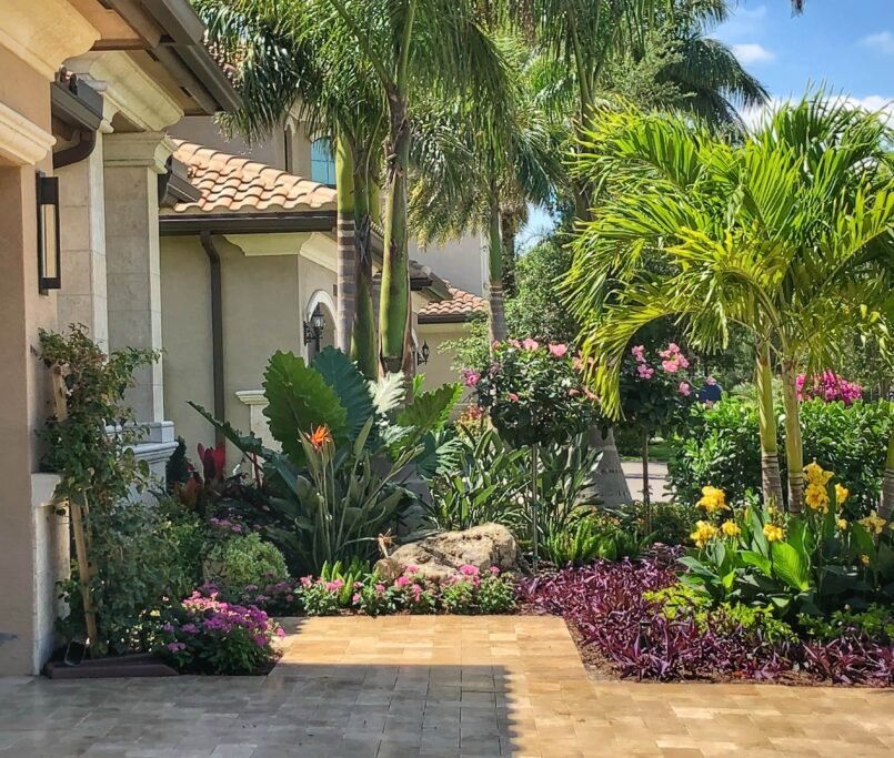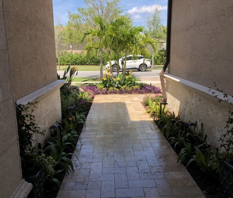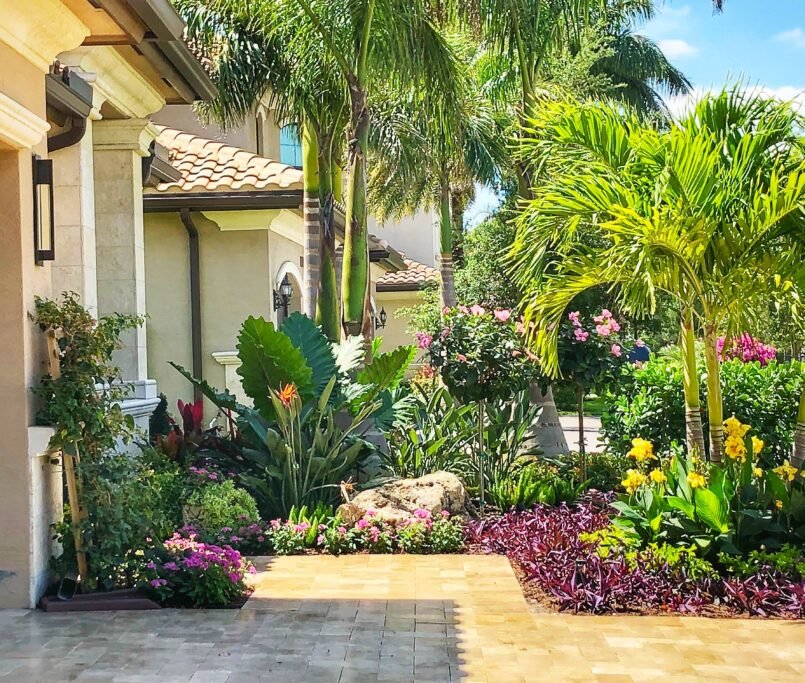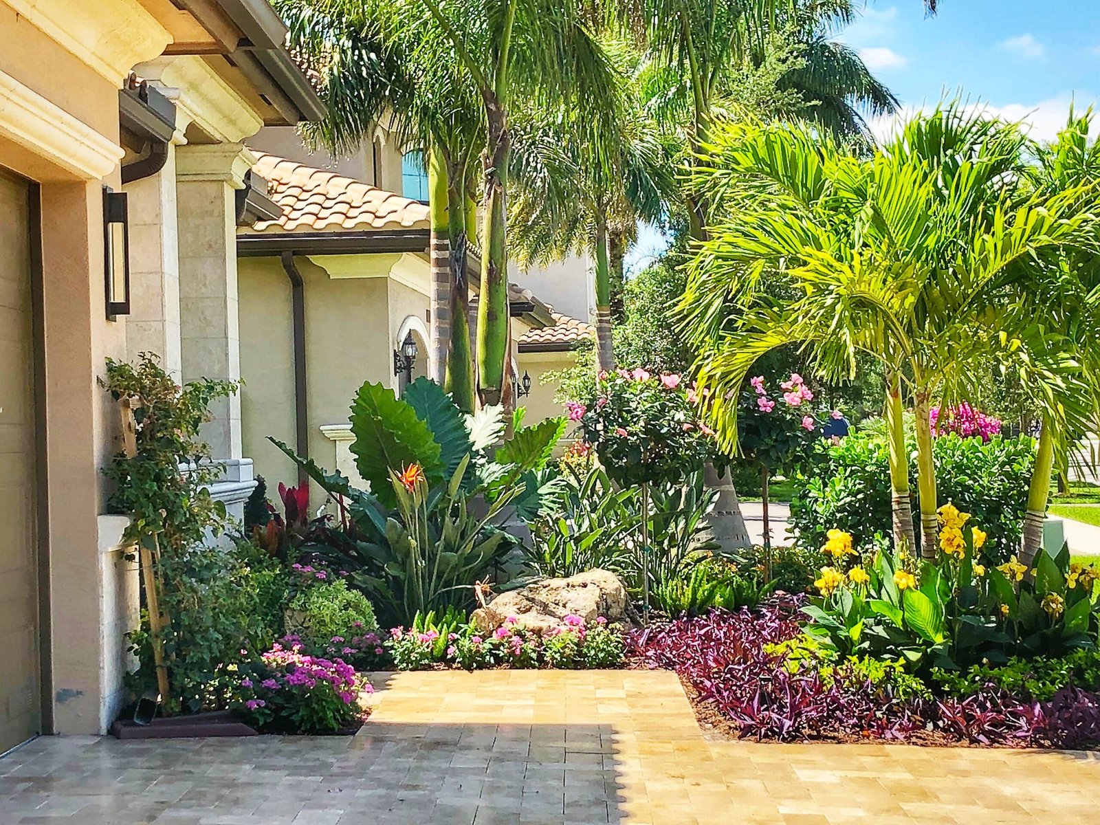 This landscape project came together in my favorite way. A call came in out of the blue. We met that week and immediately agreed to make a garden together. My clients, a charming retired couple who have led a full and rich life, are now in the “travel the world phase” of their life. They wanted a gorgeous tropical garden to return home to that did not require much intervention on their part. The results are all new plantings with lots to attract the eye at any point during the year. Their brief included a “strong tropical feel” and inclusion of some of their most loved plants, such as the statuesque royal palms that anchor the front of the house, a flowering crape myrtle, soft pink bougainvillea, and big-leaved tropicals such as alocasia varieties. One of my favorites for impact!