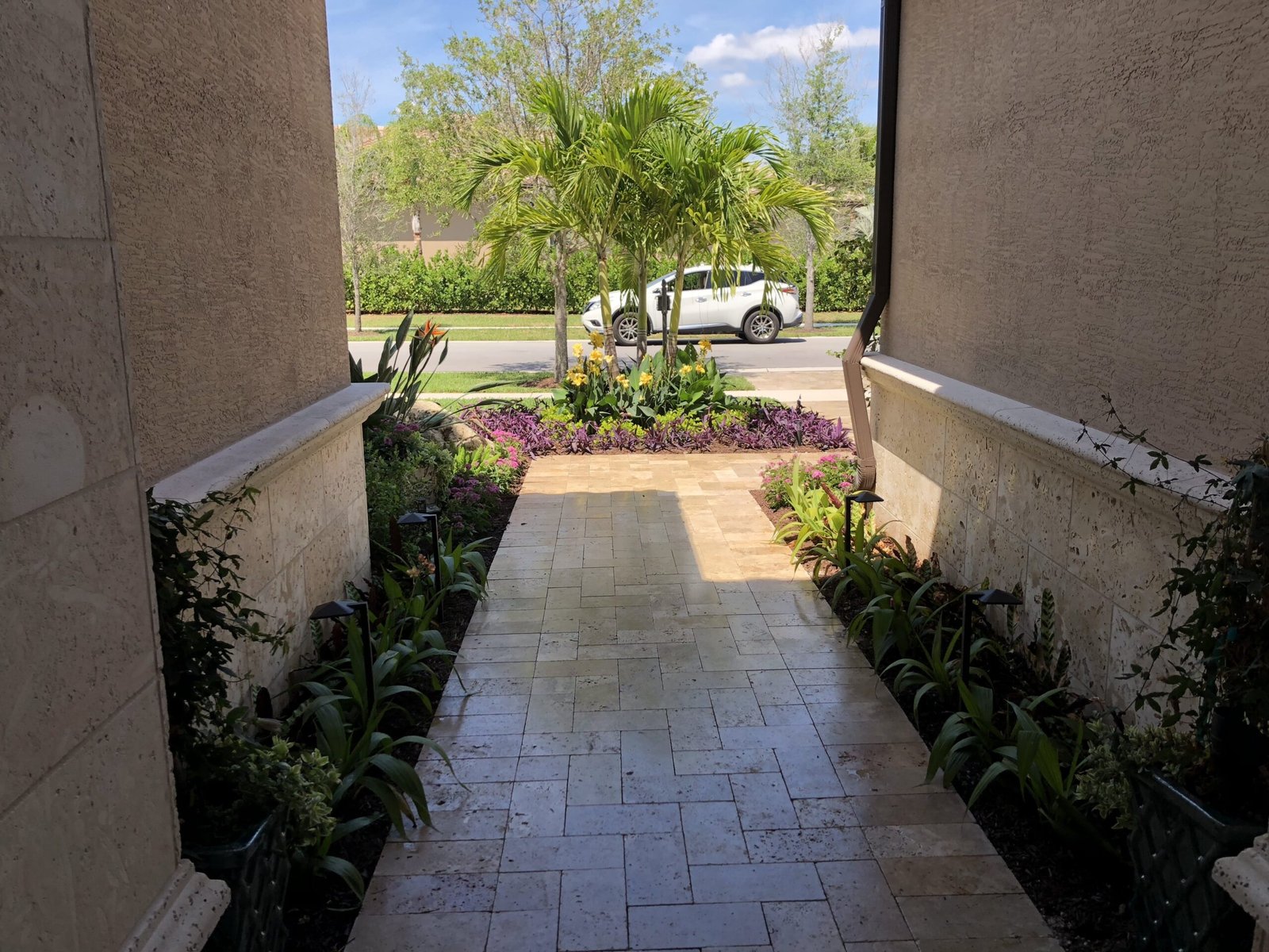 Some of the specimens were chosen to evoke the feeling of the American South where they are both from. Instead of a southern “ go to” such as hydrangeas that don’t work in South Florida, we like to use dombeya that flower abundantly in striking pink pom poms. Their lakeside view was softened with a ring of smaller palms and a custom trellis that provides privacy and a floral backdrop for a separate seating area at the extreme end of the rear garden.